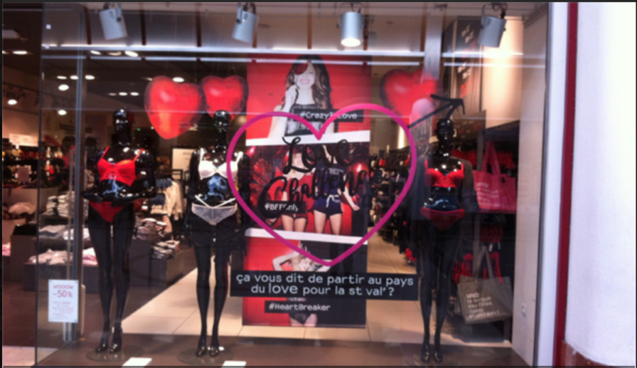 Ici, un exemple de mise en valeur de vitrine pour la Saint-Valentin.